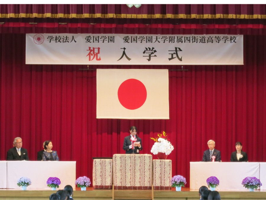理事長先生、校長先生、来賓の皆様より温かい祝辞をいただきました。また、在校生代表から歓迎の言葉が贈られました。続いて、新入生代表が誓いの言葉を述べ、これから始まる学校生活への決意を力強く表明しました。